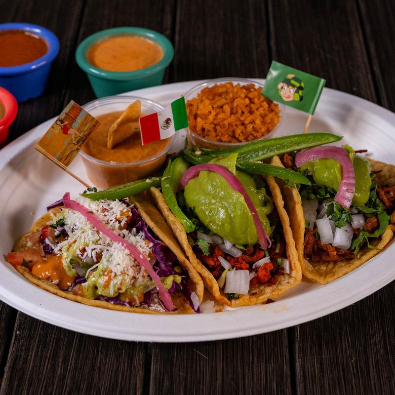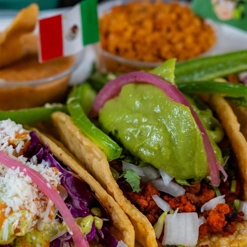 3 handmade tortilla tacos ,protein of your choice , side of rice and beans w/agua fresca