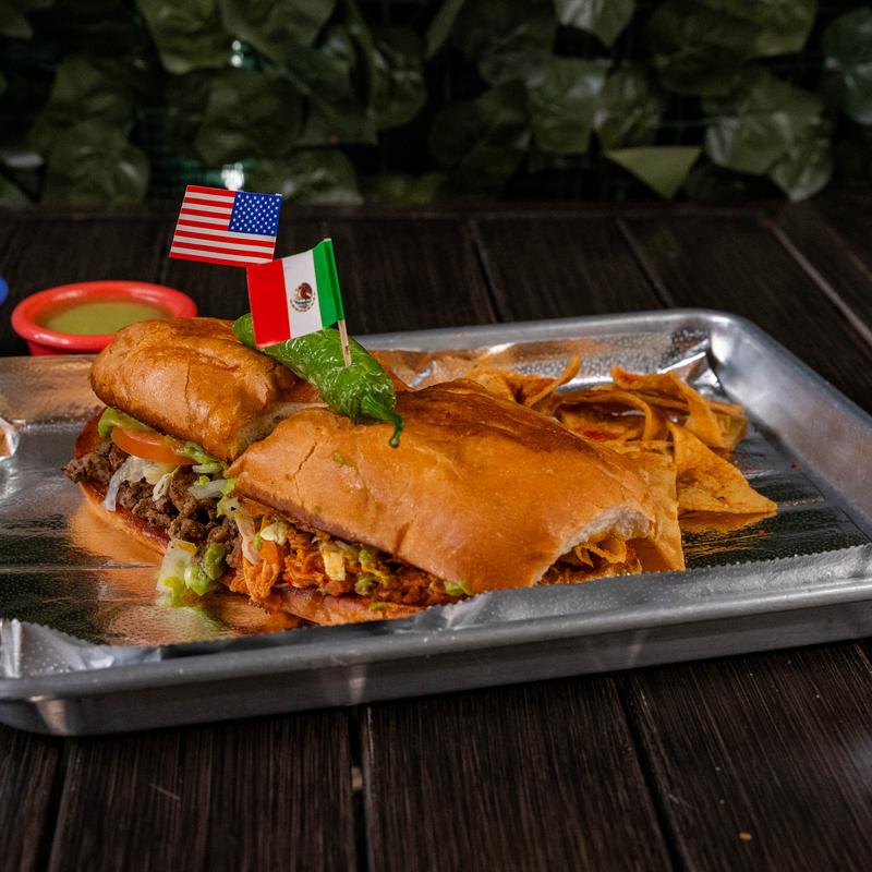 Torta ahogada with pork carnitas.