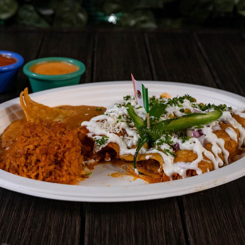2 enchiladas, protein of your choice, choice of your sauce, topped with Monterey Jack cheddar cheese.