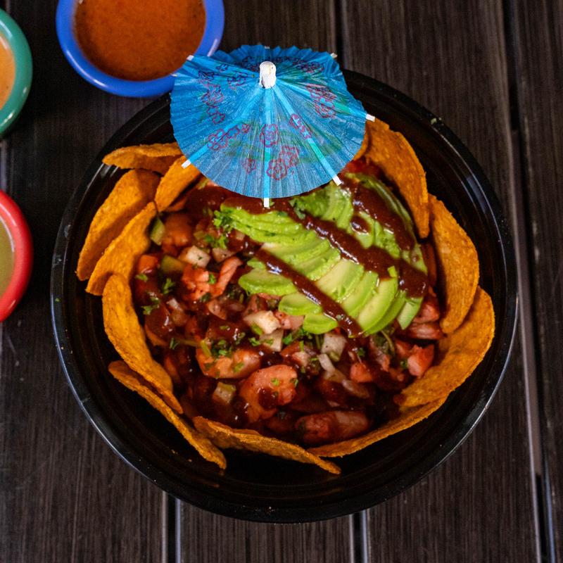 Drenched with salsa, carnitas, beans, rice, and pickled onions. Choose any of our 5 salsas